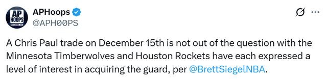 北京时间12月12日,据名记Siegel在播客节目上透露,12月16日完成克里斯-保罗的交易并非不可能——明尼苏达森林狼队与休斯顿火箭队均已表达了对这位后卫的兴趣。
